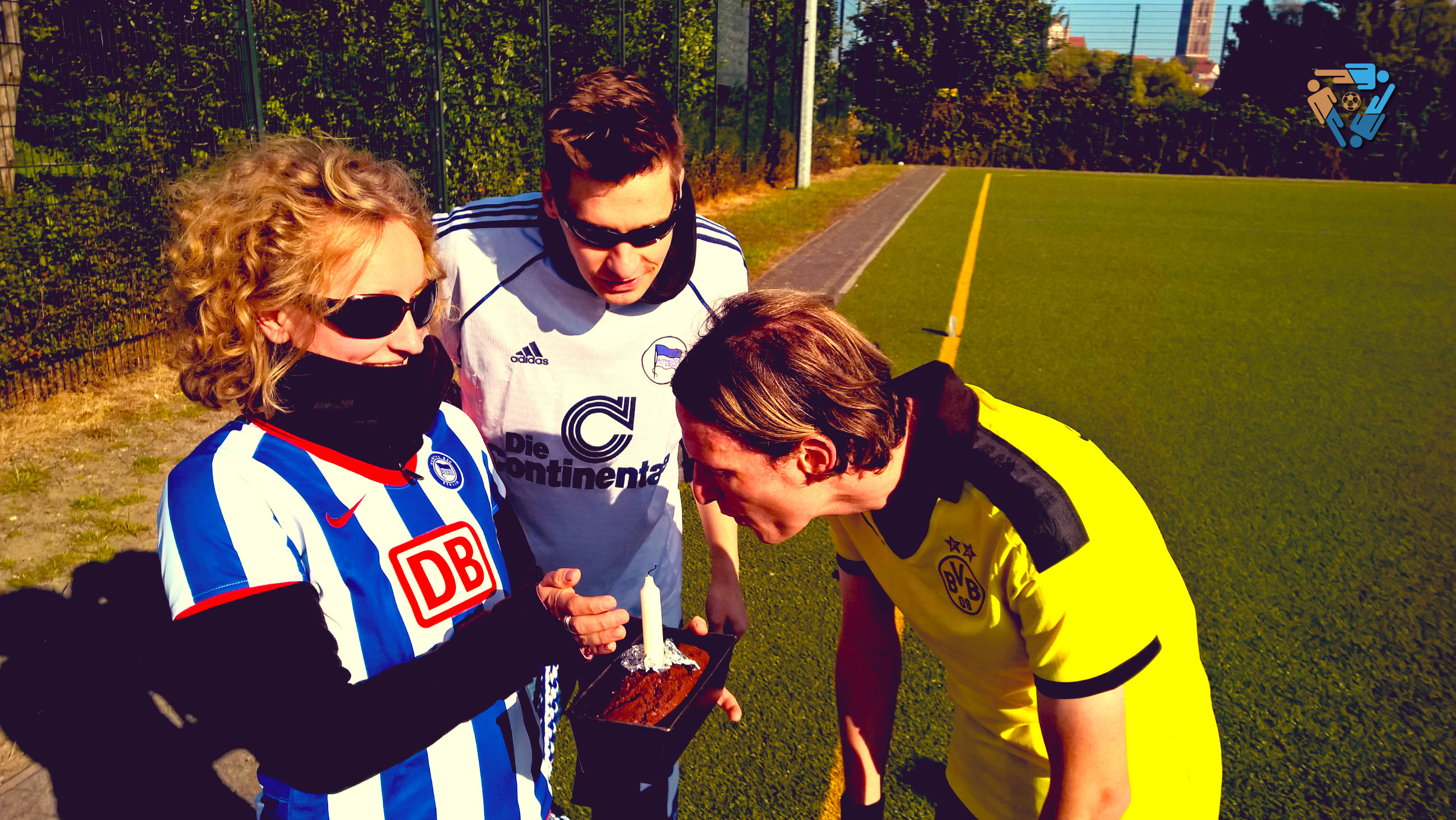 Spielunterbrechung nach wenigen Minuten am Kopfgrätsche-Samstag wegen Pyro! Am Spielfeldrand brannte plötzlich und unerwartet eine Nebelkerze. Reflexartig lief der rüstige Jubilar Jürgen zu den zündelnden Fans um das lodernde Feuer zu löschen. Die Supporter Jana und John hatten aber noch mehr im Gepäck: Wichtige Sportlernahrung und ein neues Spielgerät.