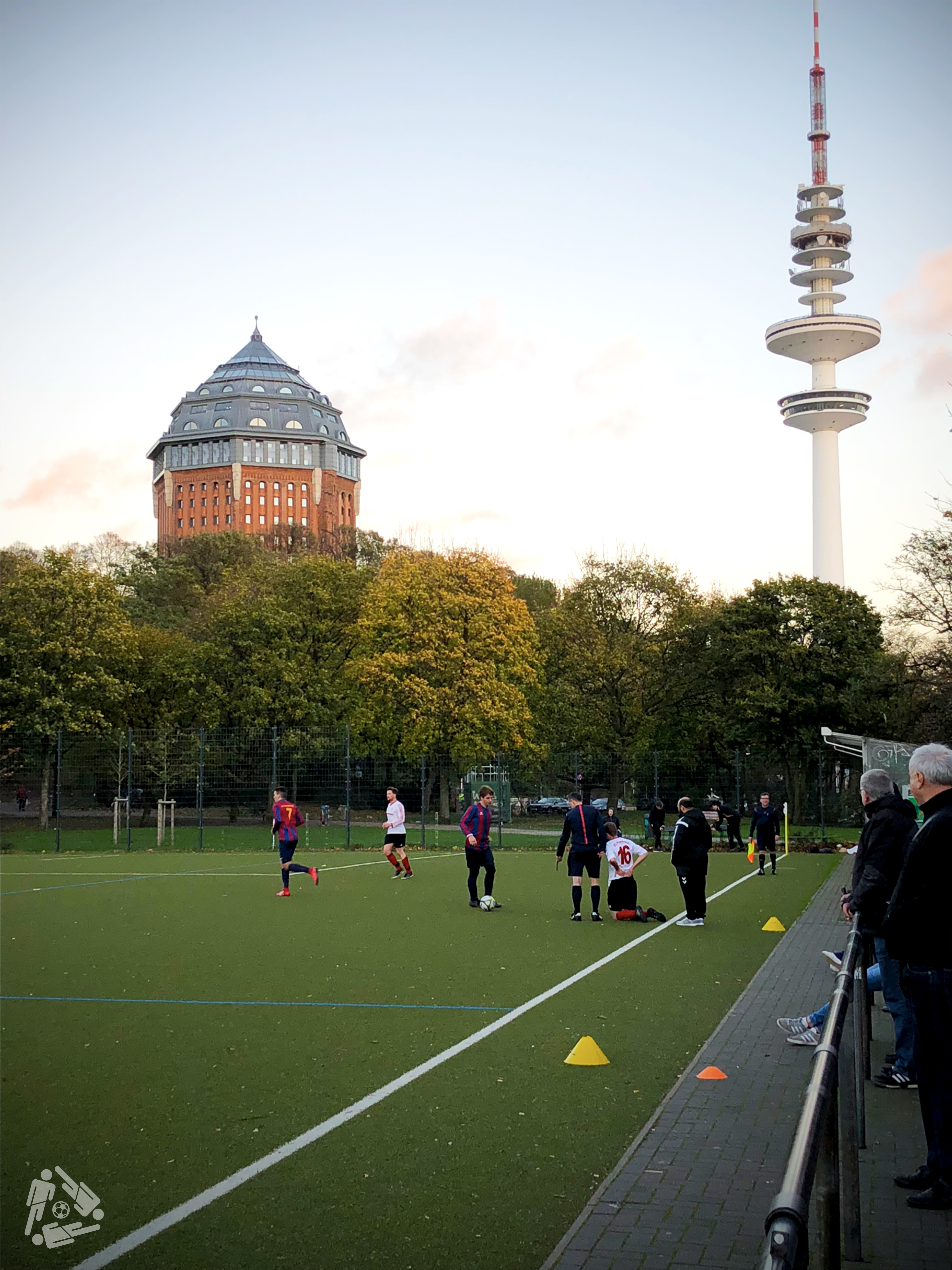 Friedliche Co-Existenz auf dem Sportplatz Sternschanze am Fuße von Wasser- und Fernsehturm im Schanzenpark. Hier sind der SC Sternschanze von 1911 und der VfL Hammonia von 1922 zu Hause und liefern sich das eine oder andere Nachbarschaftsduell. In direkter Nachbarschaft zum FC St. Pauli kommen hier Amateurkicker auf ihre Kosten. Nach dem Spiel kann man sogar auf dem Dom am Heiligengeistfeld ein paar Standards an der Bolzplatzbude üben. Ob die HSV-Fahne beim Zielen hilft?