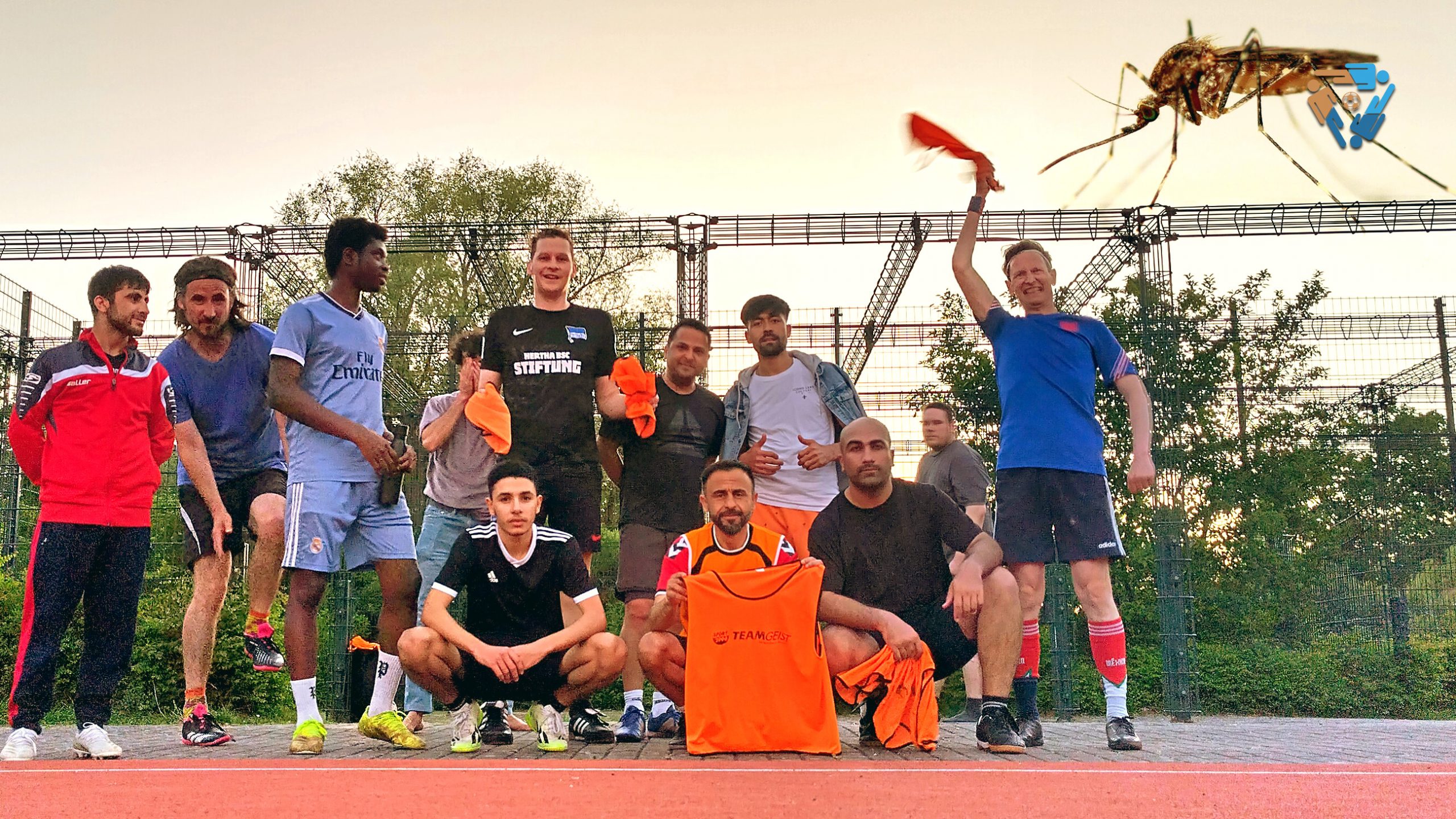 Wer heute mal kurz ins Gebüsch musste, lief Gefahr, nicht von dort wiederzukommen. Sofort haben sich die riesigen Mücken auf einen gestürzt – zu Hunderten… ach, zu Tausenden! Nun soll man ja aus einer Mücke keinen Elefanten machen, aber das war heftig: Eigentlich sollte dieses Foto das Kopfgrätsche-Foto des Jahres 2024 mit den meisten Mitspielern werden. Immerhin hatten wir mit drei Mannschaften und mit Auswechslern gespielt. Stück für Stück wurden es immer weniger. Auf dem Foto sind es nur noch 12 – Anfangs waren es aber fast 20 Mitspieler.