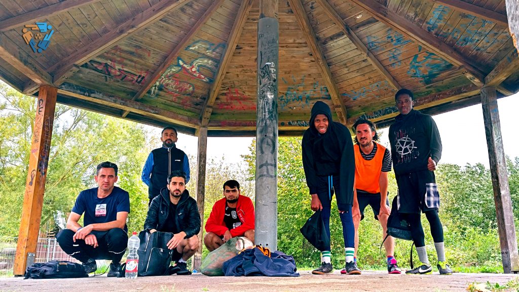 „Slippery, when wet“ war das Motto, nachdem es Nachts geregnet hatte. Unser Ausweichplatz an der Kapitänspromenade trocknete an den schattigen Stellen nicht. Beim vier gegen drei hörten wir irgendwann bei jeweils fast 30 Toren auf zu zählen. Danach wechselten wir auf das, was die Alt-#Kopfgrätsche|r „“Franks Modus“ nennen. Und dann kam der Regen, weswegen wir uns für das Abschlussfoto unter die benachbarte Pagode retteten.